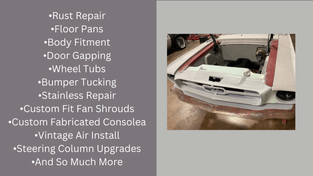 Designing for daily drivers or high end competing show cars; creating one off pieces is my specialty. But I can knock out rust repair jobs or install Vintage Air unites, just the same.